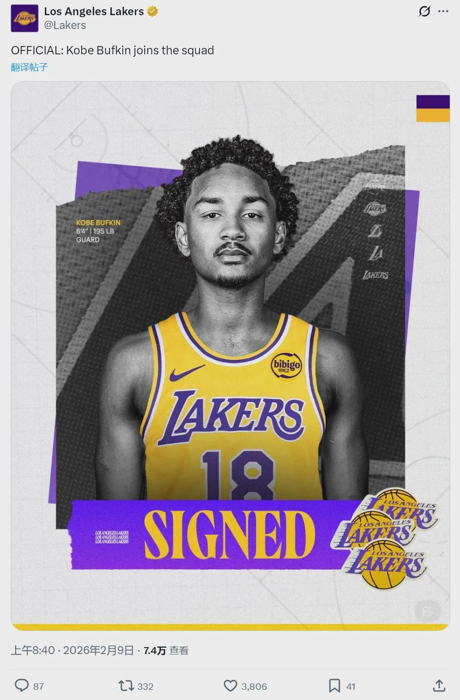 北京时间2月9日,湖人官方宣布:两年合同签约科比-巴夫金,下赛季是球队选项。很多球迷以为湖人把最后一个名额留给NBA的买断市场,但湖人签了一个本赛季长期在发展联盟出战的球员。这样一来,湖人本赛季15人大名单已满。