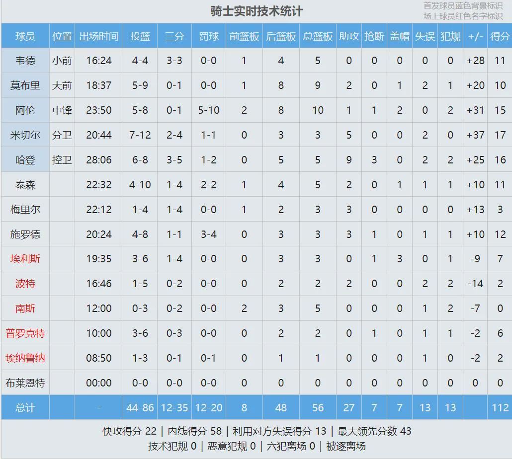 三节打完,骑士102-67领先篮网35分。第四节双方换上纯替补阵容,明天骑士背靠背打黄蜂,今天主力得到充足的休息时间。末节骑士进攻断电,篮网趁机缩小分差。第四节骑士仅得10分,全场结束,骑士112-84大胜篮网28分!