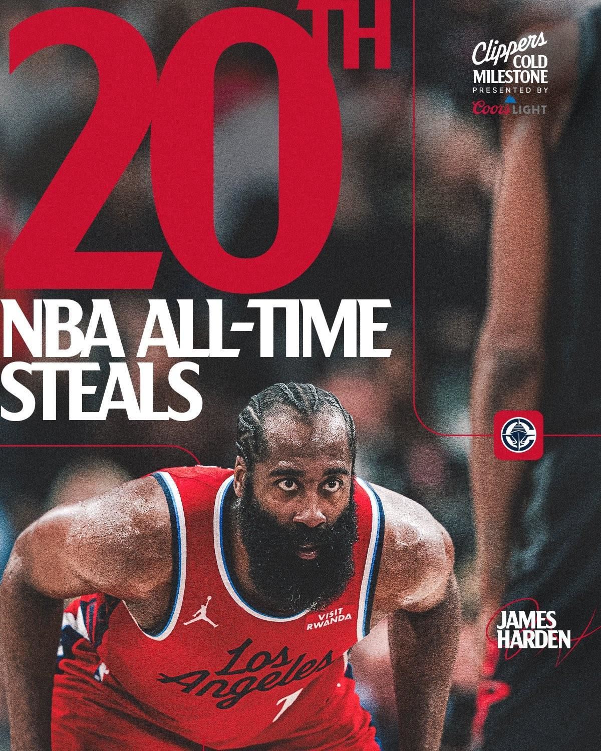 哈登生涯抢断数来到1766,超越伊戈达拉排名历史第20