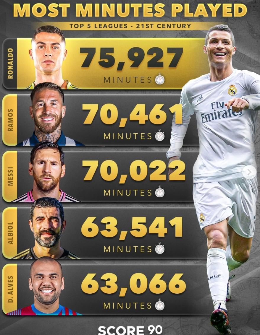 据Score90的数据统计,在21世纪欧洲五大联赛中,C罗出场时间75927分钟居首,拉莫斯70461分钟排名第二,梅西70022分钟排名第三。21世纪欧洲五大联赛出场时间前十榜单1、C罗 75927分钟2、拉莫斯 70461分钟3、梅西 70022分钟4、阿尔比奥尔 63541分钟5、阿尔维斯 63066分钟6、加雷斯-巴里 61860分钟7、特里 611020分钟8、阿斯皮利奎塔 60934分钟9、兰帕德 59737分钟10、莱万 58579分钟