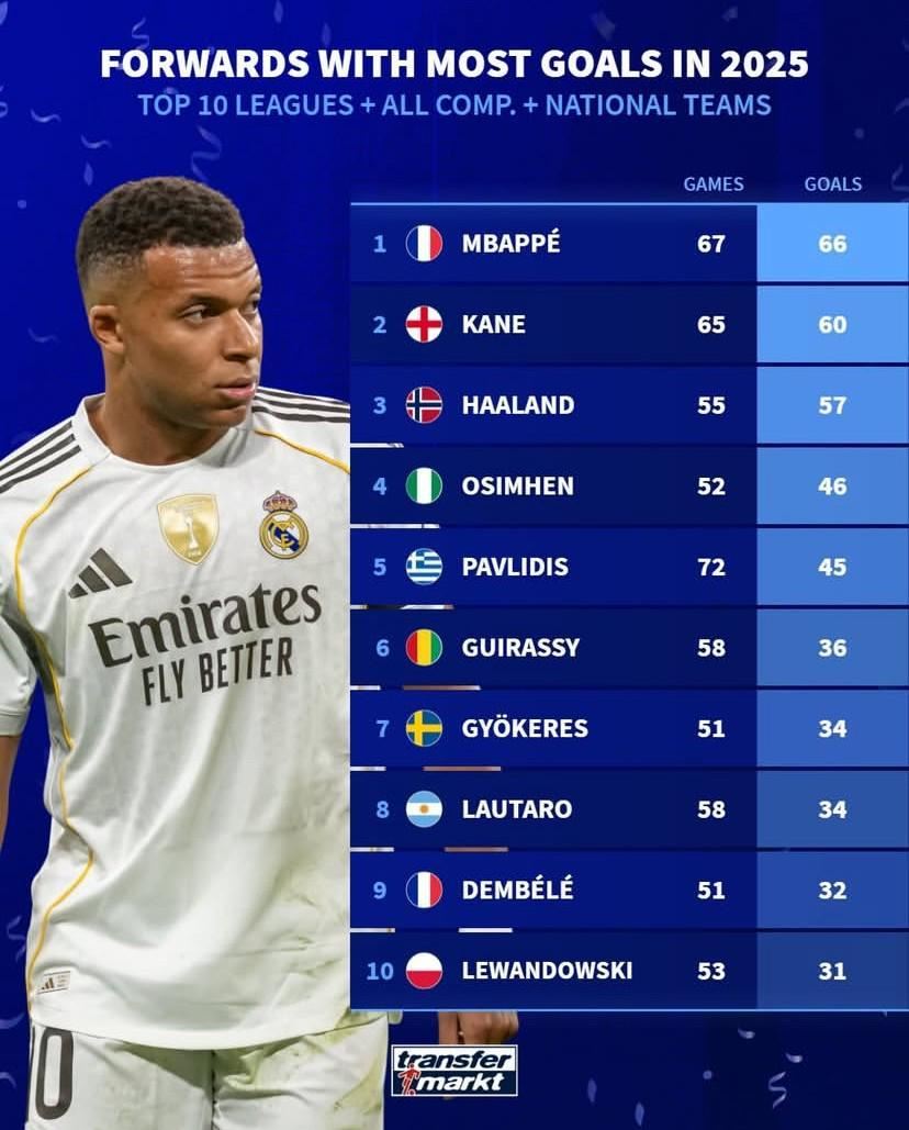 北京时间1月4日,德转列出了2025年欧洲前10联赛的前锋在国家队和俱乐部各项赛事中进球数TOP10,姆巴佩67场进66球第1,哈里-凯恩65场进60球第2,哈兰德55场进57球第3。